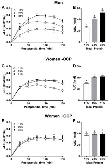 Change in resting EE (ΔEE) following ingestion of each of three isocaloric meals containing different protein levels (11, 23, and 31% total energy as protein). Values are mean ± SEM. Left panels (A,C,E) indicate 30 min means; right panels (B,D,F) indicate the area-under-curve (AUC) over 180 min. Bars not sharing superscript (i.e., a,b) are significantly different (p < 0.05) from one another by repeated measures ANOVA. OCP: oral contraceptive pill.