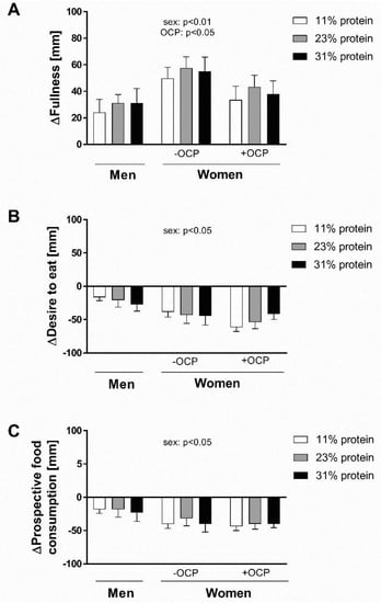 Change in visual analog scale (VAS) ratings of (A) fullness, (B) desire to eat, and (C) how much food the participants thought they could eat (prospective food consumption) after ingestion of an isocaloric meal containing one of three meal protein levels (11, 23, and 31% total energy as protein) relative to baseline (fasted) ratings. Values are mean ± SEM. OCP: oral contraceptive pill; ns: not significant.