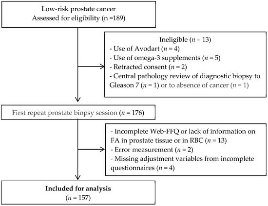 The current cross-sectional study investigates how FA levels are associated with a high-grade PCa (grade group ≥ 2) at the first repeat biopsy, which was performed for randomization into the trial. A planned analysis of the first 48 patients, which amounted to about one-fourth of all patients recruited, has already been published [28]. We present here the data at baseline for the complete study population. From 189 men recruited for this study, 176 were eligible according to exclusion criteria listed in Figure 1. Men were included if information was available for FA intake obtained from FFQ, as well as FA levels in RBC and in prostate tissue (n = 157).