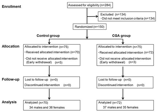 Figure 1 shows the study flow from subject selection to analysis. From a total of 284 individuals who underwent screening, 150 subjects who met the inclusion criteria and not the exclusion criteria were selected and randomly allocated to the control group or CGA group (n = 75/group). Five subjects in the control group and three subjects in the CGA group withdrew consent before the intervention period. Accordingly, 142 subjects (control group, 70; CGA group, 72) participated in and completed the trial. The subject characteristics are summarized in Table 2. The test drink consumption rates were 99.8% ± 0.5% in the control group and 99.6% ± 0.8% in the CGA group, with no significant difference between the two groups. Table 3 shows the energy intake, protein intake, fat intake, carbohydrate intake, and physical activity (number of steps) at zero and 12 weeks. There was no group × time interaction, and no change in dietary content or physical activity during the test drink consumption period.
