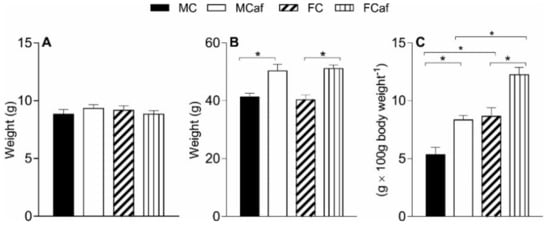 Biometric parameters of male and female mice fed a standard (MC and FC) or cafeteria diet (MCaf and FCaf) are shown in Figure 1. As previously reported in cafeteria diet-induced obese mice [], there was no significant difference in the initial weight between the groups (Figure 1A); however, at the end of the experimental period (14th week), a significant increase in body weight was found in the cafeteria diet-fed groups, of 21.7% for MCaf and 26.7% for FCaf, compared to their respective counterparts (MC and FC), with no effect of sex between the groups (Figure 1B). The amount of body fat was also measured in the groups as the adiposity index. Effects of both diet and sex were found. The cafeteria diet induced a significant increase in the percentage of body fat (Figure 1C) in both sexes, and the relative increase was higher in males (+65.4%) and females (+41.6%) compared to MC and FC, respectively. Females fed a standard diet (FC) had a higher absolute adiposity index than males (MC; +71.7%). The cafeteria diet increased the adiposity index in FCaf by 41.6% and in MCaf by 65.4% when compared with their counterparts fed standard diet.
