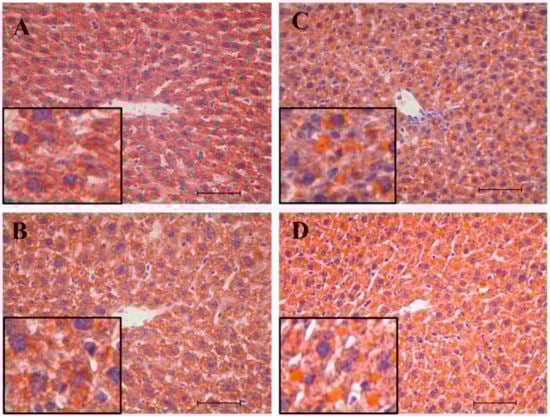 Representative images of 20× of Sudan III staining of the liver of male and female mice fed a standard or a cafeteria diet. Frozen sections from the livers of MC—male fed a standard control diet (A), MCaf—male fed a cafeteria diet (B), FC—female fed a standard control diet (C) and FCaf—female fed a cafeteria diet (D) stained with Sudan III to reveal lipid droplets (in orange) disposed along the hepatic tissue counterstained with hematoxylin-eosin (nuclei in blue). In the center of the image are centrilobular veins. Scale bar represents 50 µm.