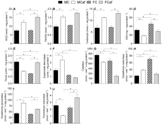 It should be mentioned that our previous study evaluated the SOD, CAT and GPx activities in liver homogenates, which assesses the enzyme activities irrespective of their compartmentalisation []. In liver homogenates, there was (a) no change in SOD activity in either males or females; (b) a relative decrease in CAT activity due to the cafeteria diet, similar to the findings of this study; and (c) increased GPx activity in FC compared to MC, while the cafeteria diet induces a relative reduction in its activity in both FCaf and MCaf []. In the current study, however, the GPx activity in mitochondria isolated from FC and MC was similar and the cafeteria diet induced an increase in activity in both males and females, which was greater in MCaf.