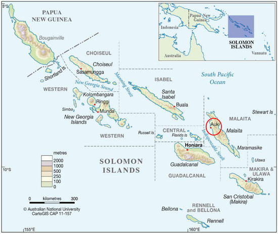- CartoGIS Services; College of Asia and the Pacific; The Australian National University. Solomon Island–Provinces. 2019. Available online: http://asiapacific.anu.edu.au/mapsonline/base-maps/solomon-islands-provinces (accessed on 20 May 2019).