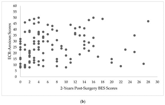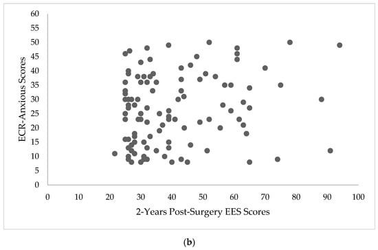 The relationship between attachment style and BES scores at 2-years post-surgery, EES scores at 2-years post-surgery, and %TWL are depicted in Figure 1a,b, Figure 2a,b and Figure 3a,b, respectively.