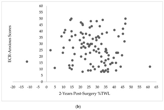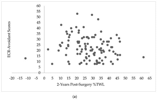 Scatterplots depicting the relationship between 2-year percent total weight loss (%TWL) and Experiences in Close Relationship Scale (ECR) scores. (a) Scatterplot depicting the relationship between 2-years post-surgery %TWL and ECR-avoidant scores (n = 108). (b) Scatterplot depicting the relationship between 2-years post-surgery %TWL and ECR-anxious scores (n = 108).