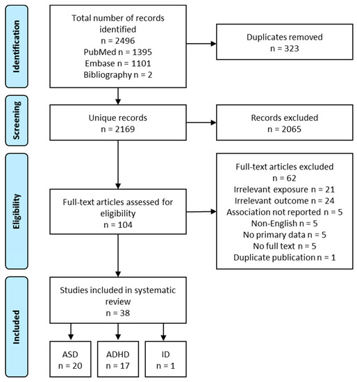 A total of 2167 unique records were obtained from the systematic literature search. After screening the titles and abstracts, 102 relevant records remained. After the full-text review, 36 articles were included. Two additional articles were identified from the bibliographies of existing literature reviews, resulting in a total of 38 studies. Overall, 20 studies reported outcomes related to ASD, 17 ADHD, and 1 ID (Figure 2). The following review focuses on ASD and ADHD. Exposures in these studies included vitamins and minerals (i.e., folate, iron, calcium, and iodine), fatty acids (i.e., PUFA), foods (i.e., fish, fruits), supplements (i.e., multivitamins), and dietary patterns. Nutrients intake or status were grouped together with relevant food sources (e.g., folate with multivitamins, PUFA with seafood) to facilitate the interpretation of the findings. Nutrients or foods reported only in a single study were not reviewed below.