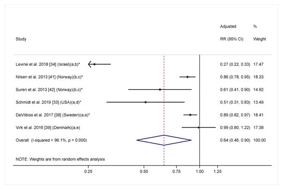 Adjusted relative risk (RRs) of offspring ASD risk associated with maternal intake of supplement containing folic acid, multivitamin or prenatal vitamin during pregnancy (with or without pre-pregnancy use). The overall effect size was estimated using random effects models weighted by inverse variance of each study. One data point was included for each study. Estimates covering any period during pregnancy were included. When estimates for folic acid and multivitamin were both available, the one for folic acid were selected. Notes: (a) Exposure during pregnancy; (b) Intake of supplement containing folic acid vs. no; (c) Exposure before and during pregnancy; (d) Folic acid intake ≥600 mcg/day vs. <600 mcg/day; (e) Intake of multivitamin vs. never/rarely. * p < 0.05.