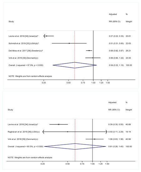 Adjusted relative risk (RRs) of offspring risk of ASD associated with maternal intake of supplement containing folic acid, multivitamin or prenatal vitamin during (top) and before (bottom) pregnancy. The overall effect size was estimated using random effects models weighted by inverse variance of each study. Notes: (a) Intake of supplement containing folic acid vs. no; (b) Folic acid intake ≥600 mcg/day vs. <600 mcg/day; (c) Intake of multivitamin vs. never/rarely. * p < 0.05.