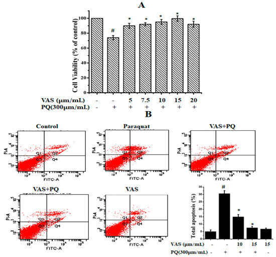 Effect of paraquat and vasicinone on SH-SY5Y cell viability. (A) Cells were pre-incubated with different concentrations of vasicinone for 24 h, and paraquat (300 μM) was added for an additional 24 h. Data are expressed as the percentage of the untreated control ± SD, n = 3. # p < 0.01, significantly different from control cells; * p < 0.01, compared with paraquat-treated group by one-way ANOVA. (B) Cell apoptosis and necrosis detected by flow cytometry. The results are shown as the percentage of the means and SDs for three independent experiments. # p < 0.01, significantly different from control cells; * p < 0.01, compared with paraquat-treated group. VAS: Vasicinone; VAS + PQ: Vasicinone + Paraquat.
