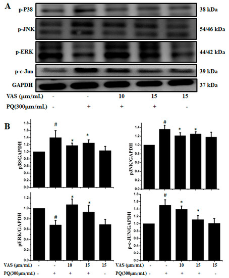 The MAPK signaling pathway is associated with progressive dysfunction in multiple neurodegenerative diseases and mitochondrial-mediated apoptosis; hence, we investigated the protective effect of vasicinone on members of the paraquat-induced MAPK pathway including JNK, ERK, c-JUN and p38 in SH-SY5Y cells. We further analyzed the phosphorylation levels of MAPK signaling molecules after treatment with vasicinone and paraquat. The protein expression levels of the p-JNK1/2, p-c-JUN and p-p38 MAPKs were increased after paraquat exposure compared to those observed without paraquat treatment, demonstrating the activation of the MAPK pathway by paraquat. Interestingly, when the cells were pretreated with vasicinone, the elevated phosphorylation of the JNK1/2, c-JUN and p38 MAPKs was inhibited, while p-ERK1/2 levels were increased compared to those observed in cells treated with paraquat alone. These results suggested that vasicinone abated the paraquat-induced injury of SH-SY5Y cells by suppressing the MAPK signaling pathway (Figure 3A,B).