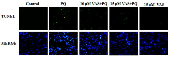 Nuclear DNA fragmentation is an important hallmark of apoptosis. To determine cell death, an in-situ terminal deoxynucleotide transferase-mediated dUTP nick end-labeling (TUNEL) assay was performed in the various treatment groups. The number of TUNEL-positive cells (green fluorescence) was dramatically higher in SH-SY5Y cells treated with paraquat than in control cells. In contrast, pretreatment with vasicinone significantly decreased these paraquat-induced changes, also there was no effect following treatment with vasicinone alone. These results confirmed that vasicinone was capable of rescuing paraquat-induced apoptotic death. This result was consistent with the decreased cell viability and increased apoptosis in paraquat-treated cells compared to those in control cells (Figure 4).