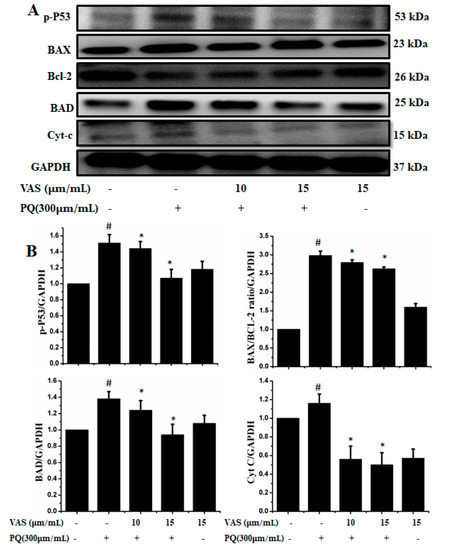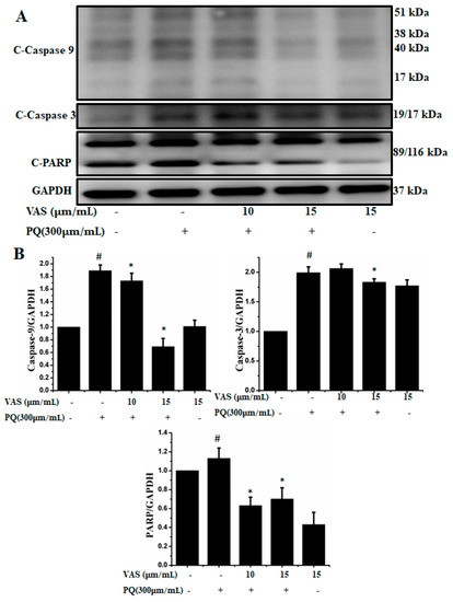 In the present study, we investigated the regulation of the p53-dependent mitochondrial intrinsic apoptotic pathway. In general, proteasome inhibition and various cellular stresses increase the levels of p53 in the cytoplasm and upregulate its downstream target, Bax, which promotes the cytochrome c release into the cytoplasm from mitochondria and activates the caspase cascade. Pretreatment with vasicinone decreased the expression of p53 induced by paraquat in SH-SY5Y cells compared to that observed in untreated cells in a dose-dependent manner (Figure 5A,B). To further investigate the protective mechanism of vasicinone against paraquat-induced apoptosis, we determined the effect of vasicinone on the expression of anti- and pro-apoptotic proteins by Western blotting. These included the Bcl-2 family proteins Bax, Bad (pro-apoptotic) and Bcl-2 (anti-apoptotic); cytochrome c, which is an essential factor of the electron transport chain; and caspase-9 and caspase-3 as inducers of the intrinsic mitochondrial apoptosis pathway. Compared to that observed in untreated cells, paraquat treatment led to the upregulation of the pro-apoptotic molecules Bax and Bad; the downregulation of anti-apoptotic Bcl-2; enhanced cytochrome c release (Figure 5A,B) and the activation of caspase-9, caspase-3 and PARP (Figure 6A,B).