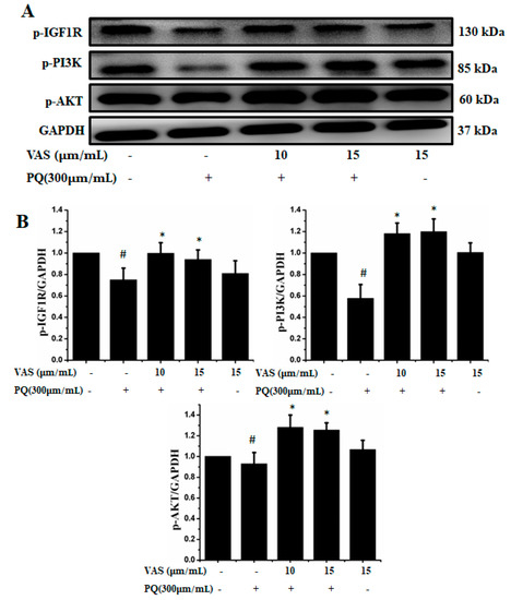 Effects of vasicinone on the activation of insulin-like growth factor 1 (IGF-1R)/PI3K/AKT signaling. (A) SH-SY5Y cells were treated with vasicinone for 24 h and then exposed to paraquat for an additional 24 h. Total cell lysates were prepared to determine the protein expression of cell survival-related proteins. GAPDH was used as an internal control protein. (B) IGF-1R, PI3K and AKT were determined by densitometry analysis. Three independent experiments were performed for this assay. Results are shown as the mean ± SD. # p < 0.01, compared with control cells; * p < 0.01, compared with paraquat-treated cells.