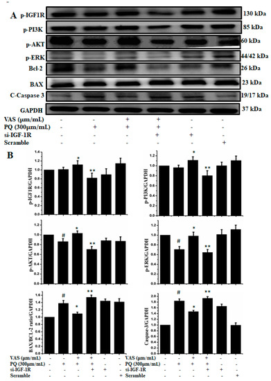 (A) Cells were transfected with 15 nM control siRNA (si Con) or IGF1R-targeted siRNA (si IGF1R) for 24 h, treated with 10 or 15 μM vasicinone for 24 h and then exposed to paraquat (300 μM) for an additional 24 h. GAPDH was used as an internal standard protein. (B) Expression of p-IGF-1R, p-PI3K, p-AKT, p-ERK, Bcl-2, apoptotic proteins Bax and caspase-3 were analyzed by densitometry of bands. Three independent experiments were performed. Results are shown as the mean ± SD. # p < 0.01, compared with control cells; * p < 0.01, compared with paraquat-treated cells; ** p < 0.01, compared with (Vasicinone + Paraquat) treated group.