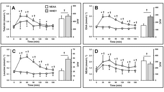 Postprandial plasma amino acid (AA) (Panel A), essential amino acid (EAA) (Panel B), leucine (Panel C), and nonessential amino acid (NEAA) concentration (Panel D) following isonitrogenous ingestion of a NEAA blend (open, n = 8) or whey protein (grey, n = 14). Data are mean +/− SD. † significant difference between groups. * Significant difference from baseline (0 min) (p < 0.05).