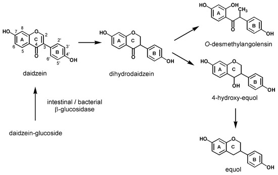 Isoflavones mainly occur in plants in the form of biologically inactive glycosides (e.g., genistin and daidzein). After ingestion, they are hydrolyzed in the gut by intestinal bacterial β-glucosidases, resulting in the formation of appropriate bioactive aglycones (e.g., genistein and daidzein) [9,10]. Daidzein can be metabolized to dihydrodaidzein and then to equol or O-desmethylangolensin (O-DMA) (Figure 1). In turn, genistein can be hydrolyzed to dihydrogenistein and then to 6ʹ-hydroxy-O-DMA (6ʹ-OH-O-DMA), which in turn can be degraded to p-ethylphenol [11]. In addition, the fermentation process increases the content of the more bioavailable aglycones. Daidzein, genistein, equol, and O-DMA are the major isoflavones detected in the blood and urine of animals and humans [12]. Nevertheless, only a fraction of aglycones can directly enter the circulation and become available to all other cells of the body. They persist in the plasma for ~24 h, with an average half-life of 6–8 h [13]. Daidzein demonstrates a higher bioavailability than genistein because it has a longer half-life in the intestine. Less-absorbed genistein degrades about twice as fast [14].