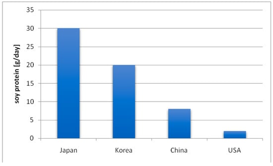 The consumption of soy and soy products varies among countries of the world (Figure 3). In Asian countries, where soy is the most popular vegetable, the recommended range is 20–50 g of soy per day [7,19]. In the United States and most Western countries, its consumption is less popular.