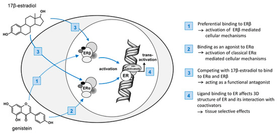 Due to the structural similarity of isoflavones to 17-β-estradiol (Figure 2), they are also called phytoestrogenes. Isoflavones may bind to both estrogen ERα and ERβ receptors, thus exhibiting both estrogenic and antiestrogenic properties. However, isoflavones have a low estrogenic potency compared to estradiol [16]. The distribution of ERα and ERβ receptors depends on the tissue types. Reproductive tissues, especially those of the uterus and breast, are abundant in estrogen receptors. 17-β-estradiol shows the same level of affinity toward ERα and ERβ receptors, whereas isoflavones show a greater affinity toward ERβ receptors. Binding of the phytoestrogen to the receptor may result in partial activation of the receptor (agonistic effect) or displacement of the estrogen molecule, thereby reducing receptor activation (antagonistic or antiestrogenic effect) [17]. Researchers are interested in tissue selective phytoestrogens because antiestrogenic activity in reproductive tissues can help reduce the risk of hormone-related tumors (e.g., breast, uterus, and prostate), while estrogenic activity in other tissues can help maintain the bone mineral density and improve blood lipid profiles [18].