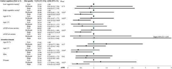 Forest plot of the association between diet quality and cognitive decline over 2 years stratified by important covariates. Cognitive decline was defined as the lowest tertile (T1) of the cognitive change over 2 years, and the higher tertiles (T2 + T3) indicated normal cognition. 1 Low vegetable variety was defined as the lowest tertile (T1) of the quantity-adjusted vegetable variety, and high vegetable variety was defined as the higher tertiles (T2 + T3). Multivariable models were adjusted for age, sex, years of education, APOE e4 status, the corresponding cognitive variable at baseline, total calories, depressive symptoms, and quantity-adjusted vegetable variety. Additional variables adjusted for different outcome variables included annual disposable income for global cognition. Abbreviations: MoCA-T, Montreal Cognitive Assessment—Taiwanese version; T, tertile; AOR, adjusted odds ratio; CI, confidence interval; APOE, apolipoprotein E. * ptrend < 0.05