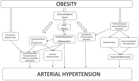 Figure 1 describes the complex network which links obesity to arterial hypertension. The effect of different kinds of adipose tissue is shown—PVAT directly promotes local inflammation and contributes to endothelial dysfunction. Visceral AT can induce leptin and insulin resistance, which increase both systemic vasoconstriction and endothelial dysfunction. Moreover, visceral adipose tissue can directly activate the sympathetic nervous system. Perirenal adipose tissue, through mechanical compression, is involved in the RAAS activation and in renal sympathetic system activity. All these pathways, widely interrelated among each other, lead to increased arterial BP in obese subjects.