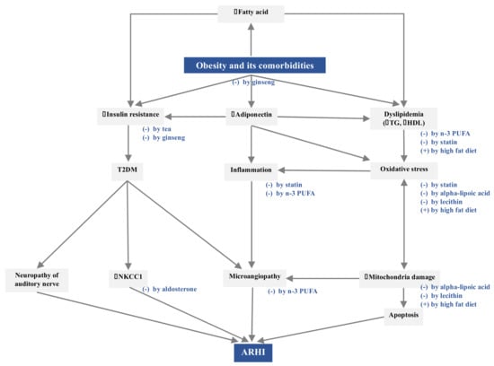 Obesity and comorbidities contribute to ARHI via increased insulin resistance, decreased adiponectin levels, and dyslipidemia. A high-fat diet might lead to dyslipidemia and induce oxidative stress, mitochondrial damage, and apoptosis in the inner ear. Statins might improve the lipid profile, reduce oxidative stress, and inhibit endothelial inflammation. Aldosterone could upregulate NKCC1 for maintaining the endocochlear potential and high potassium concentration in the endolymph. n-3 PUFA could preserve the cochlear microcirculation by reducing dyslipidemia and inhibiting the inflammatory state. Alpha-lipoic acid and lecithin might protect the cochlear mitochondrial DNA from damage by oxidative stress. Tea and ginseng might protect against ARHI through their anti-obesity and anti-diabetic effects.