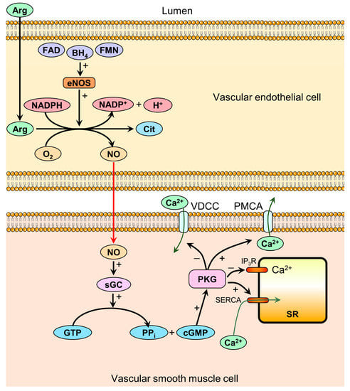 Mechanisms of nitric oxide-mediated vasodilation. Plasma Arg provides the substrate for the synthesis of nitric oxide (NO) via the enzyme endothelial nitric oxide synthase (eNOS) located in the vascular endothelium. The enzymatic reaction requires the co-substrates O2 and nicotinamide adenine dinucleotide phosphate (NADPH) and the cofactors BH4, flavin adenine dinucleotide (FAD), and flavin mononucleotide (FMN). NO diffuses from the endothelial cell to the smooth muscle cell and activates soluble guanylyl cyclase (sGC), resulting in increased cyclic guanosine monophosphate (cGMP) production. cGMP subsequently activates protein kinase G (PKG), resulting in decreased [Ca2+]i via at least four mechanisms: 1. Inhibition of voltage-dependent calcium channels (VDCC), reducing calcium influx. 2. Activation of plasma membrane calcium ATPases (PMCA), increasing ATP-dependent calcium efflux. 3. Inhibition of inositol triphosphate receptors (IP3R), reducing calcium release from the sarcoplasmic reticulum (SR) to the cytoplasm. 4. Activation of sarcoplasmic calcium ATPases (SERCA), increasing the ATP-dependent sequestration of calcium from the cytoplasm to the SR. Decreased [Ca2+]i mediates smooth muscle relaxation via the activation of myosin light chain kinase and the inhibition of myosin light chain phosphatase (not shown in figure), resulting in vasodilation.