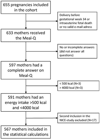 Of the 655 women included in the NICE cohort, 633 received the Meal-Q (Figure 1). Reasons for not receiving the questionnaire were: Inclusion in the study after pregnancy Week 34, delivery of the baby before gestational Week 34 (the survey was sent out during Week 34), intrauterine fetal death, or no valid e-mail address available. Of those who received the questionnaire, 597 (94%) responded to all the questions. Women who reported a daily energy intake of <500 kcal (N = 3) or >4000 kcal (N = 3) were excluded. In addition, women with multiple enrolments (N = 17 of the women with completed Meal-Q) were only included with their first pregnancy. This resulted in 567 women being included in the statistical analyses (Figure 1).