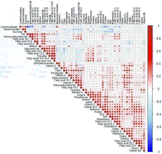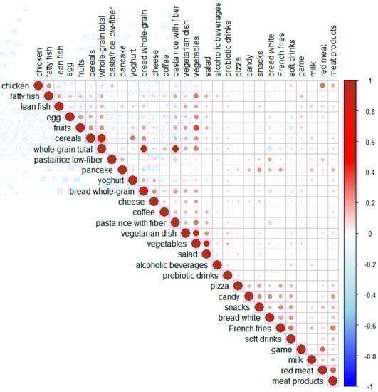 Correlation plot of food intake by all the subjects (N = 567). The model groups together all the variables that are highly correlated and places them next to one another. The magnitude of the correlation is denoted with a color, whereby red indicates a positive correlation and blue denotes a negative correlation. The stronger the correlation, the darker is the color, and the larger is the dot.