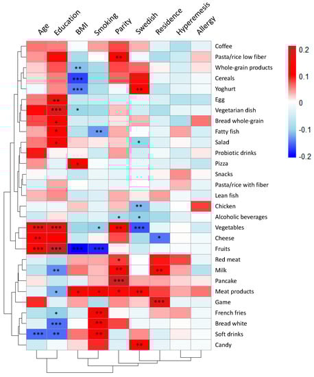 Heat map of correlations between food items and maternal characteristics (N = 567). The magnitude of each correlation is denoted with a color, whereby the red color indicates a positive correlation and dark-blue color represents a negative correlation., such that the deeper the color, the stronger is the correlation. Univariate statistics were applied to reveal significant associations. For dichotomous variables, i.e., parity, smoking, hyperemesis, and allergy, the Mann–Whitney U-test was used. For categorical variables, such as education and residential address, the Kruskal–Wallis test was used. For continuous variables, such as age and BMI, Spearman’s correlation test was used. Levels of statistical significance are denoted as: * p < 0.05, ** p < 0.01, *** p < 0.001.