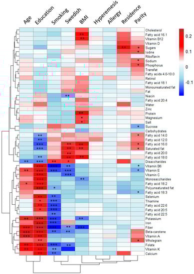 Heat map of correlations between micronutrients and maternal characteristics (N = 567). The magnitude of each correlation is designated by a color, whereby the dark-red color indicates a strong positive correlation, and dark-blue color represents a strong negative correlation. Univariate statistics were used to find significant associations. For dichotomous variables, i.e., parity, smoking, hyperemesis, and allergy, the Mann–Whitney U-test was used. For categorical variables, such as education and residential address, the Kruskal–Wallis test was used. For continuous variables, such as age and BMI, Spearman’s correlation test was used. Levels of statistical significance are denoted as: * p < 0.05, ** p < 0.01, *** p < 0.001.