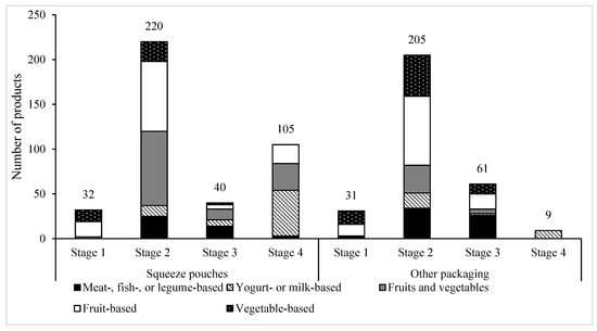 Pureed, ready-to-serve products by packaging type, stage, and food category (n = 703). Approximate age of targeted eater by stage are as follows: Stage 1 (~4–6 months), stage 2 (~7–8 months), stage 3 (~9–12 months), stage 4 (~12 months and older).