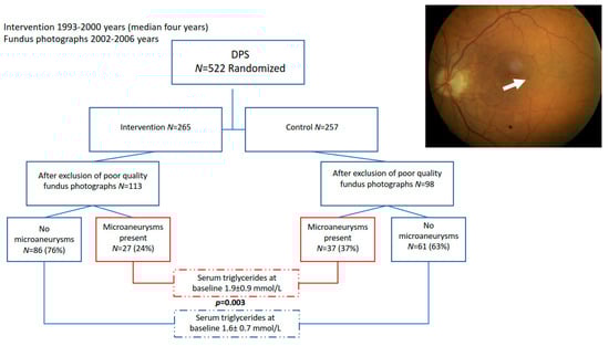 In the Finnish Diabetes Prevention Study (DPS) [8], which recruited participants with impaired glucose tolerance (IGT), the lower risk of developing T2D was associated with better insulin sensitivity (IS) and preserved β -cell capacity, probably achieved by changing lifestyles [8,9,10,11]. In this post-hoc analysis, we show decreased retinal microvascular abnormalities in the intervention group of the DPS and suggest that elevated serum triglycerides are associated with early abnormalities of DR. The purpose of the study was to assess whether earlier lifestyle intervention had a beneficial effect on the occurrence of retinopathy.