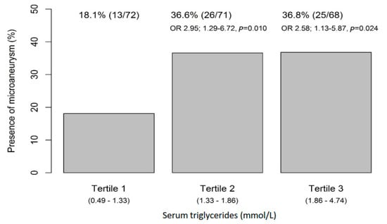 Occurrence of microaneurysms in relation to serum triglyceride tertiles at baseline. OR, odds ratio.