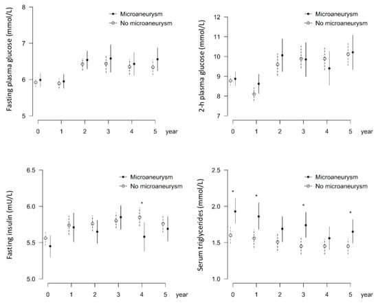Occurrence of microaneurysms in relation to fasting glucose and insulin, 2 h glucose, and triglycerides. * reveals p-values < 0.05. Data from the first five years of follow-up on metabolic variables.