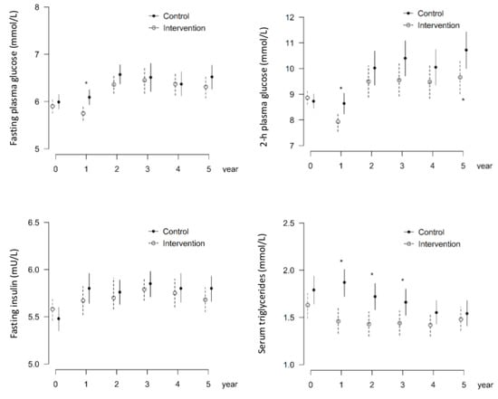 Levels of fasting glucose and insulin, 2 h glucose, and triglycerides in control and intervention study groups. * reveals p-values < 0.05. Data from the first five years of follow-up on metabolic variables.