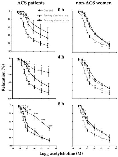 Effects of MiPo on endothelial-dependent relaxation of rat aortic rings incubated with high-density lipoproteins (HDL) from ACS patients (n = 11) and the reference group of non-ACS women (n = 6). Curves represent the % of relaxation of aorta rings, pre-contracted with phenylephrine and incubated with HDL, from before (black circles) and after 30 days of supplementation with MiPo (black squares) in function of the logarithm of acetylcholine concentration. Fasting conditions, and 4 h and 8 h after the lipid load test, are shown in the top, middle and bottom graphs, respectively. Each point represents the mean and standard error of the mean (SEM). A curve of 11 independent experiments using aorta rings incubated in the absence of HDL has been included in every graph (black triangles). Pre- and post-supplementation paired Student t test, * p ≤ 0.05 and ** p ≤ 0.01.
