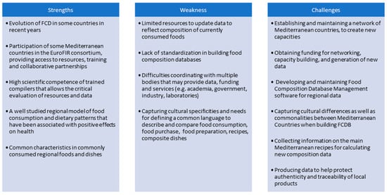 Strengths, weaknesses and challenges of food composition databases (FCDBs) in countries in the Mediterranean region.