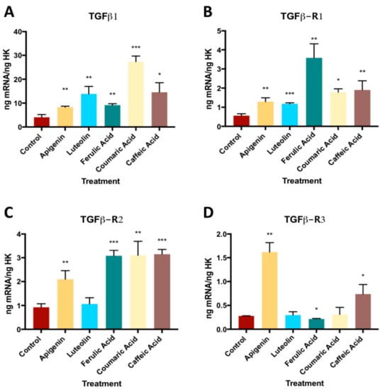 The effect of phenolic compounds on gene expression of TGFβ1 and its receptors (TGFβ-R1, TGFβ-R2, and TGFβ-R3). * p < 0.05, ** p < 0.005, *** p < 0.001. TGF-β1: Transforming growth factor β1, TGF-β receptor 1,2 and 3 (TGF-βR1, TGF-βR2, TGF-βR3).