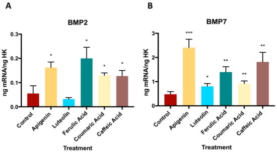 The effect of phenolic compounds on gene expression of BMP2 and BMP7. * p < 0.05, ** p < 0.005, *** p < 0.001. Bone morphogenetic proteins 2 and 7 (BMP-2 and BMP-7).