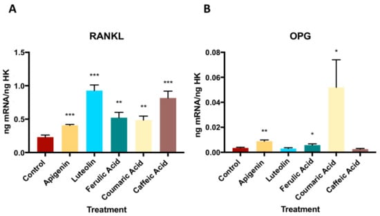 In the present study, the expression of RANKL was increased by the treatment with all studied polyphenols, especially luteolin, while the expression of OPG increased by apigenin, ferulic acid, and coumaric acid, but not by luteolin or caffeic acid. RANKL belongs to the family of the tumor necrosis factor (TNF) ligand and is expressed on mesenchymal cells, preosteoblasts, and T cells. The binding of RANKL with its receptor (RANK) stimulates osteoclast activation and differentiation []. However, OPG is a RANKL receptor that inhibits osteoclast differentiation and function, because its interaction with RANKL can prevent it from binding to RANK []. The increased expression of these markers and the higher OPG/RANKL ratio may result from activation of the Wnt canonical signaling pathway, which would favor bone tissue formation []. The phenolic compounds from various vegetable species have been found to promote osteoblast differentiation through the expression of these markers, which are closely related to bone maturation [,,,,].