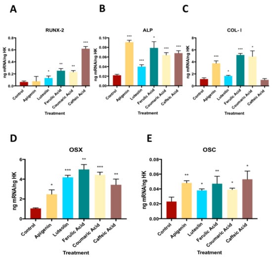 The effect of phenolic compounds on the gene expression of RUNX-2, ALP, COL-I, OSX, and OSC. * p < 0.05, ** p < 0.005, *** p < 0.001. RUNX-2: Run-related transcription factor 2, ALP: Alkaline phosphatase, COl-I: Collagen type I, OSX: Osterix, OSC: Osteocalcin.