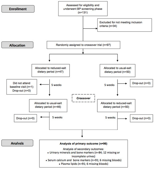 Therefore, the aim of this food-based intervention trial, was to examine, using a 5-week cross-over design, the potential for inclusion of low-salt bread as one component of a pragmatic reduced-salt diet on BP, markers of bone metabolism, and plasma lipids in adults with slightly to moderately elevated BP.