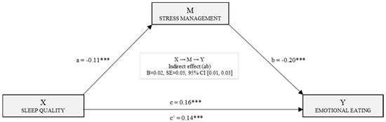 Simple mediation model of stress management in the relationship between sleep quality and emotional eating. Note. *** p < 0.001.