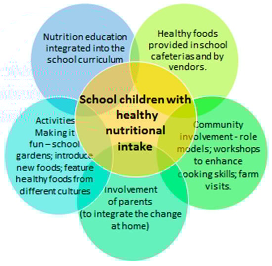 Schools are one of the easier places to implement an intervention, as there is a captive audience that is not independent and therefore ample opportunity to encourage healthy eating and appropriate levels of physical activity, and facilities are available for physical activity [34]. It is therefore not surprising that many such interventions have been carried out in schools. However, it is still possible and beneficial for communities to be involved in school-based interventions. School-based approaches to improving nutrition, reducing calorie intake and thus reducing the incidence of obesity can take a number of forms. Programs can take the form of education of students, or students and parents/families, interventions to bring about behavior change, a change in the school nutritional environment, as well as involvement of families and the community, and a combination of some or all of these approaches.