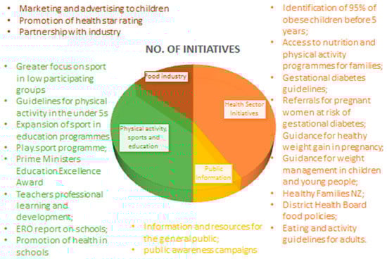 NZ launched a “Childhood obesity plan” in October 2015 with the introduction or expansion of 22 initiatives to prevent and manage obesity in those up to 18 years old (Figure 2.) [14]. The initiatives focus on foods and physical activity and involve communities, schools, families, the private sector and government agencies i.e. the plan is comprehensive and draws on evidence from the WHO Commission on Ending Childhood Obesity, as well as recent evidence from NZ and guidance from a technical advisory group. A baseline report was published in 2017 with clear points of measurement linked with childhood obesity indicators [14].