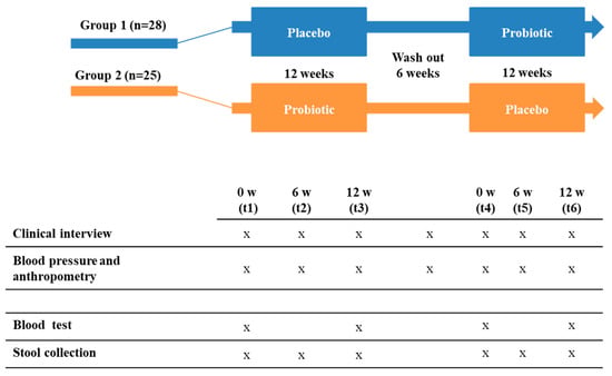 Illustration of the experimental design: A randomized, double-blind, crossover, placebo-controlled, single-center trial comparing the effect of consumption of Lactobacillus reuteri V3401 for 12 weeks on various clinical, biochemical, and inflammatory biomarkers and gastrointestinal microbiota. w: weeks; t: time; x: sample collection.
