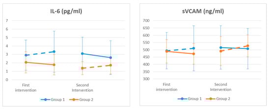 In the case of BMI, diastolic blood pressure, GOT, and LBP, we found that the washout period was not long enough to avoid the carryover effects. We found significant differences for Il-6, sVCAM (Figure 2), and insulin levels (Table 1); however, we did not find any significant results for HOMA index (Table 1).