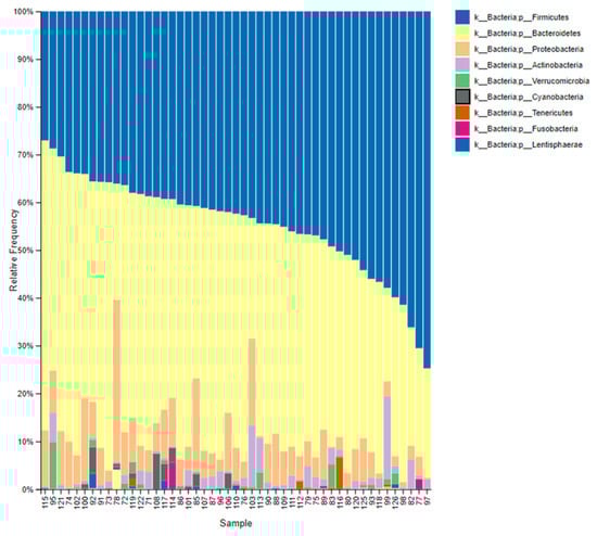 Baseline gastrointestinal microbiome composition. Taxonomic composition of the gastrointestinal communities at the beginning of the intervention. The figure shows bar charts of the relative abundance of bacteria at the phylum level. Each column represents a participant.