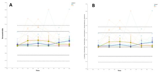 Trend of the relative proportion of Verrucomicrobia phylum and Akkermansia genus. The thick lines with error bars represent the means of both groups (Group 1: blue lines; group 2: orange lines). Dashed lines represent the means ± 2 and 3 standard deviations. Group 1 started the intervention receiving the placebo (t1, t2, and t3) and then was switched to receive the probiotic strain (t4, t5, and t6). Group 2 started the intervention receiving the probiotic strain (t1, t2, and t3) and then was switched to receive the placebo (t4, t5, and t6). (A) Temporal trend of Verrucomicrobia phylum; (B) Temporal trend of Akkermansia genus.